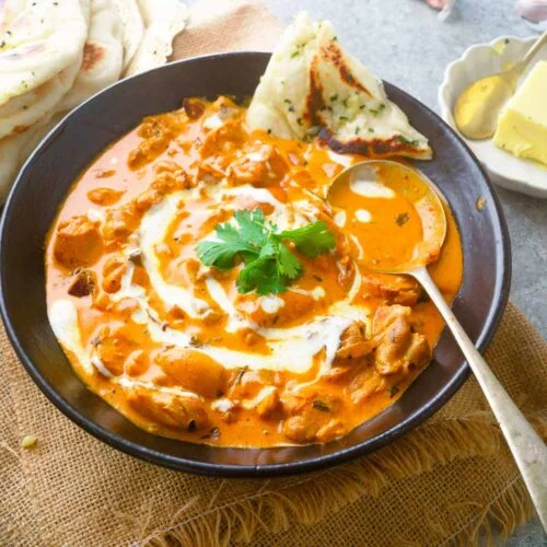 A rich, creamy Butter Chicken (Murg Makhani) in a traditional bowl, accented with a swirl of cream.