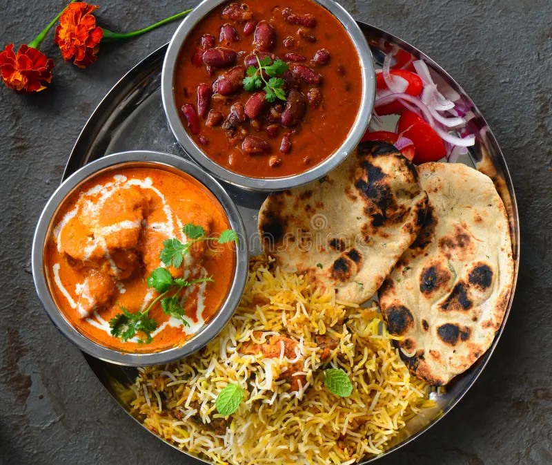 A diversified North Indian Thali featuring butter chicken, biryani, dal, roti, and more ideal for showing culinary variety.